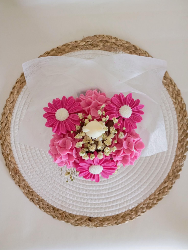 Composé de bougies artisanales façonnées à la main, ce bouquet floral séduit par ses teintes rosées et son design raffiné, idéal pour une décoration de chambre bébé.