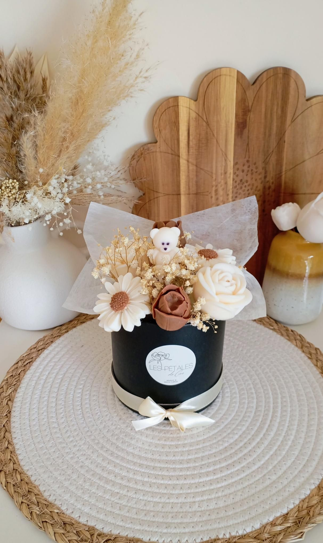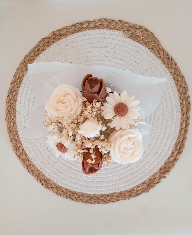 Composé de bougies décoratives en forme de fleurs aux tons doux et naturels, ce bouquet est entièrement réalisé à la main dans l’atelier Les Pétales de Cire. Chaque bougie artisanale est coulée avec soin pour offrir une finition élégante et une qualité irréprochable.